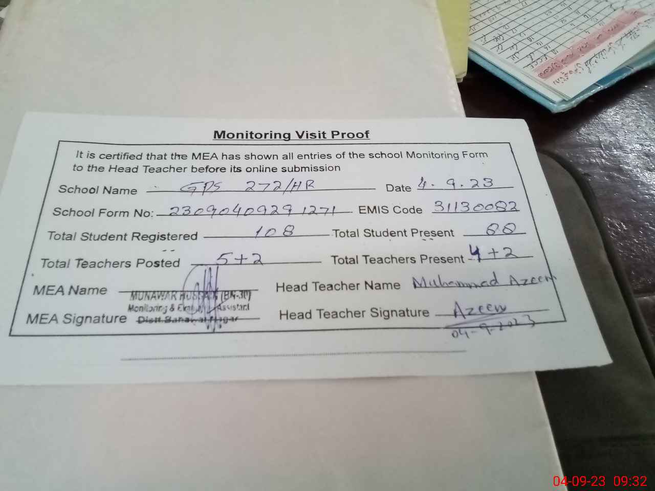| Attendance Register | Head Teacher | MEA with School | Visit Proof |