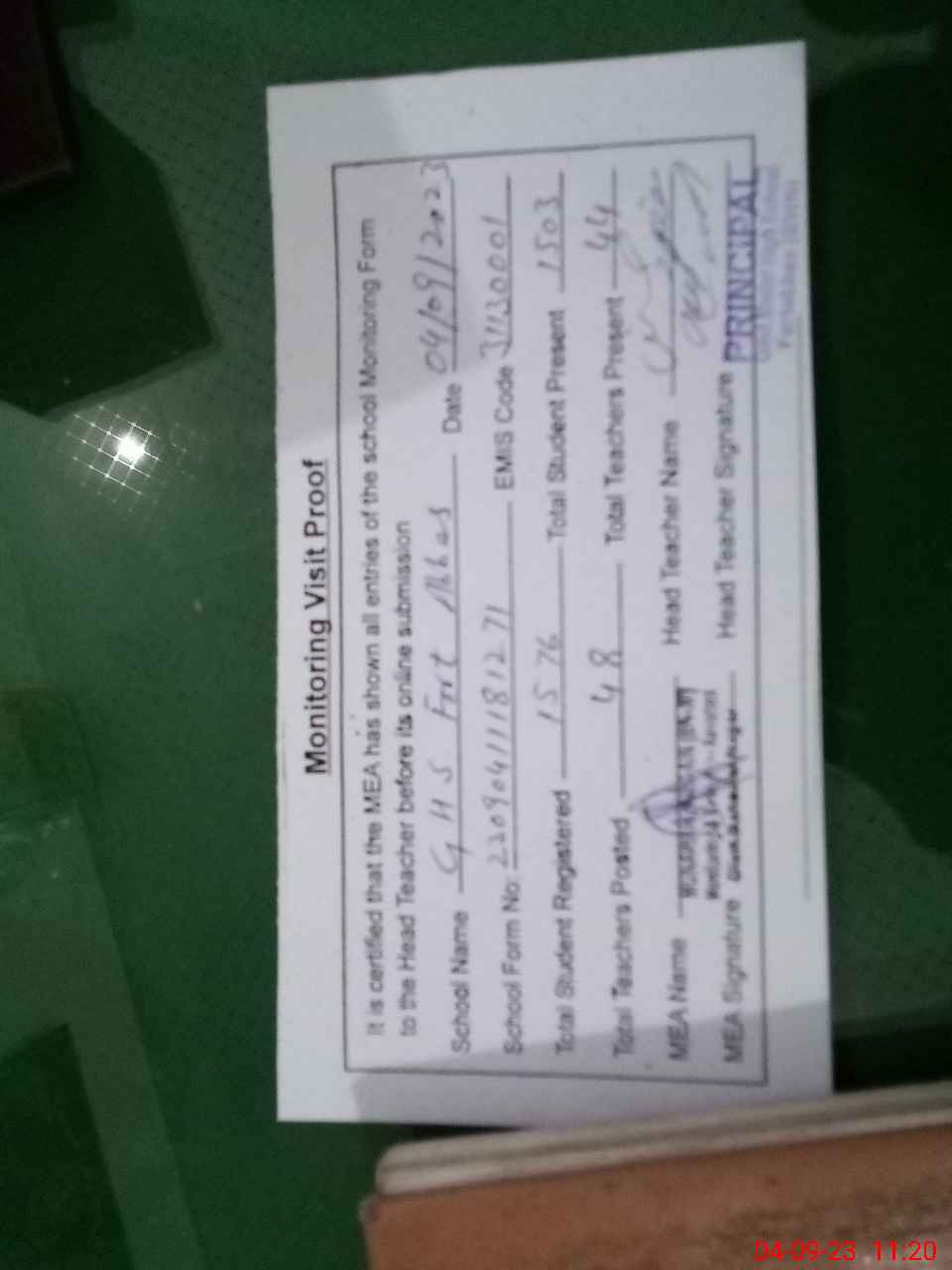 | Attendance Register | Head Teacher | MEA with School | Visit Proof |