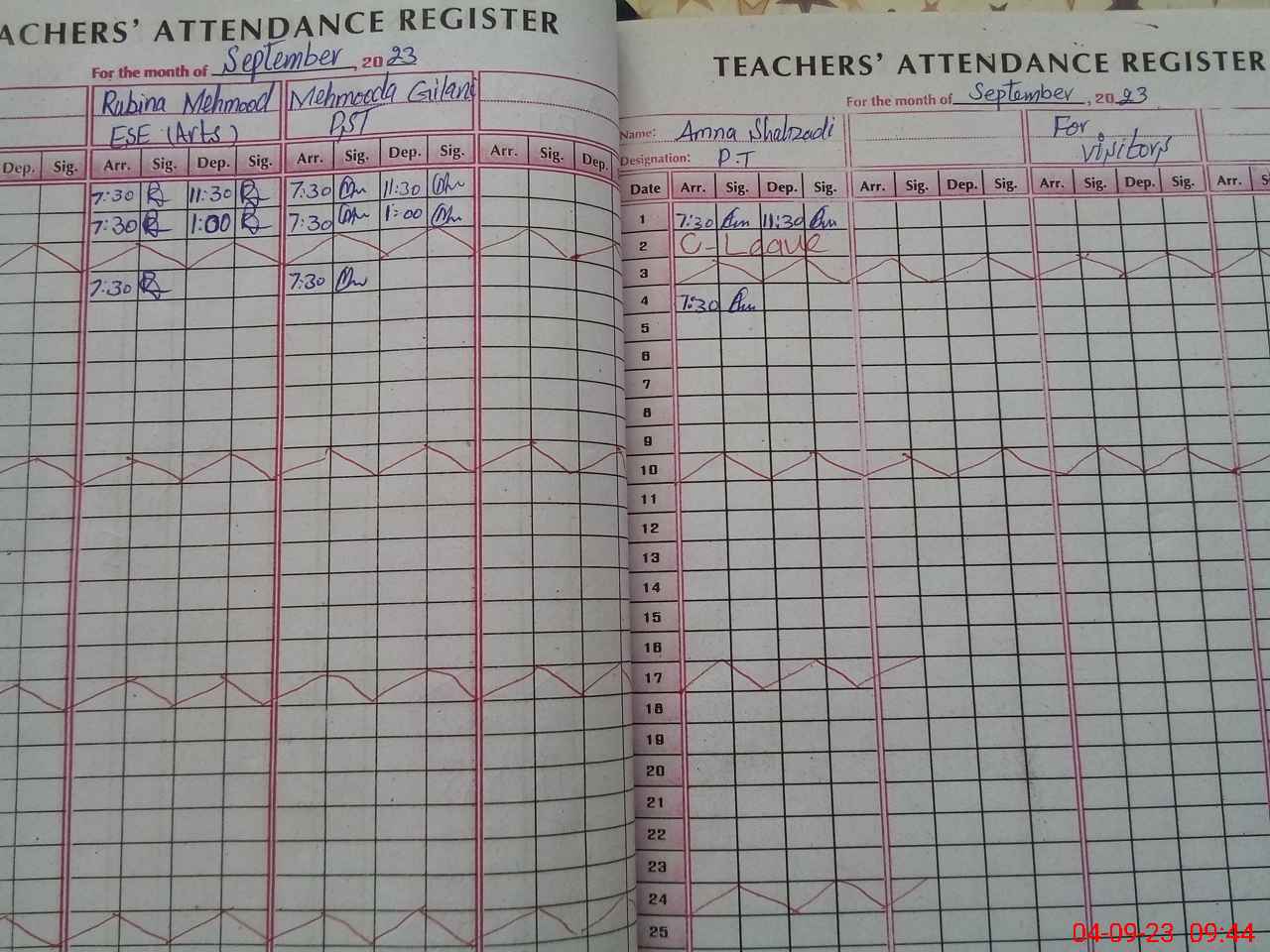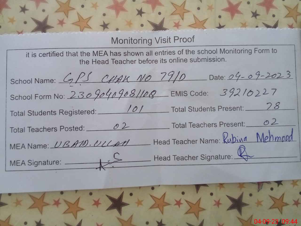 | Attendance Register | Head Teacher | MEA with School | Visit Proof |