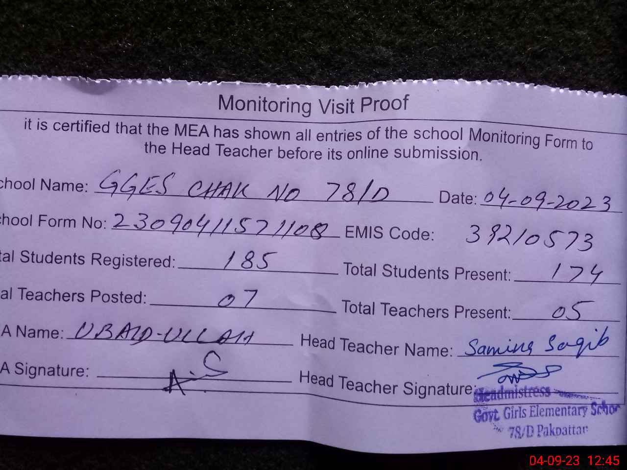 | EMIS Code: 39210573 | Name of School: GGES CHAK NO. 78/D | |||
