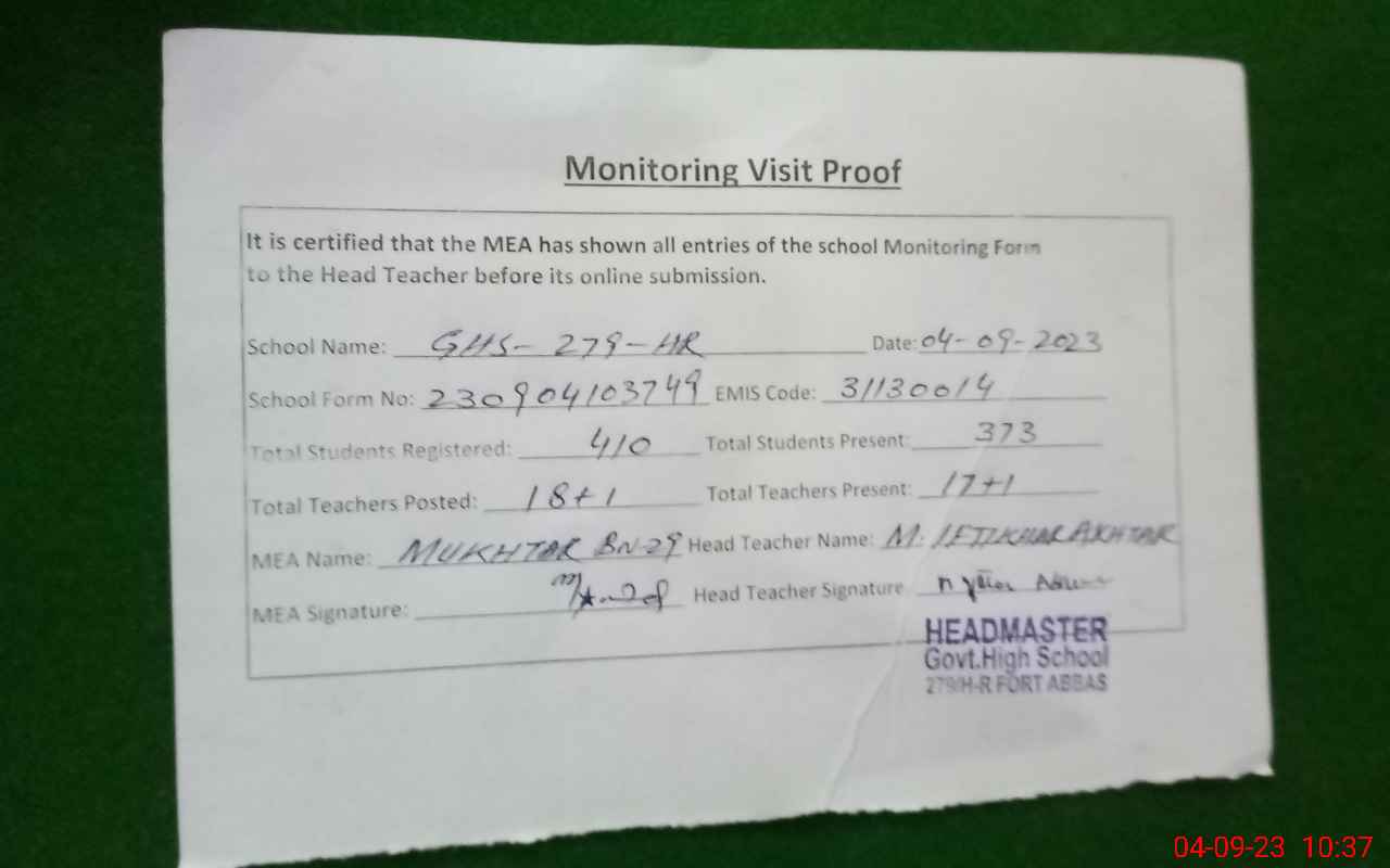 | EMIS Code: 31130014 | Name of School: GHS CHAK 279/HR | |||