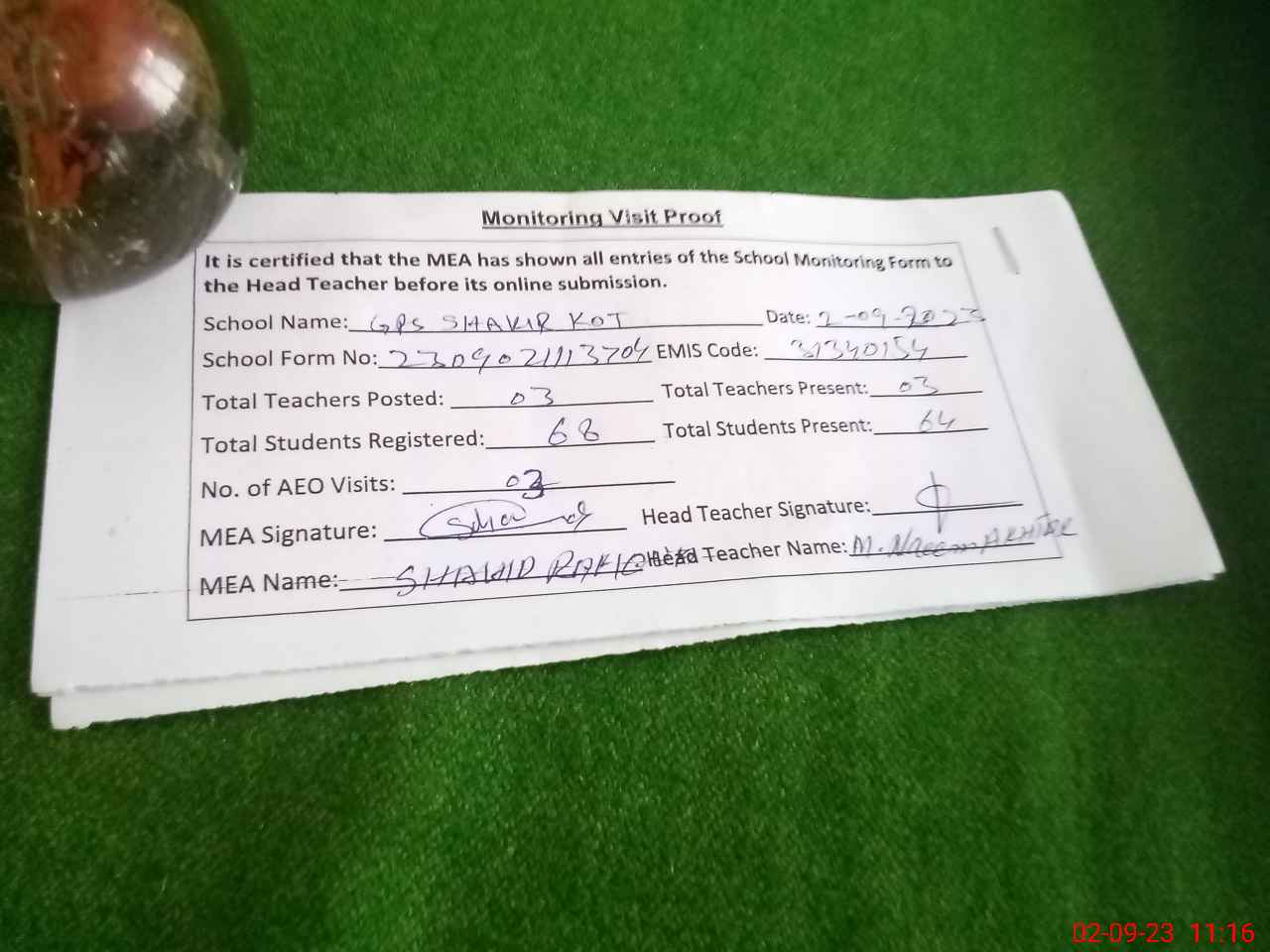 | Attendance Register | Head Teacher | MEA with School | Visit Proof |