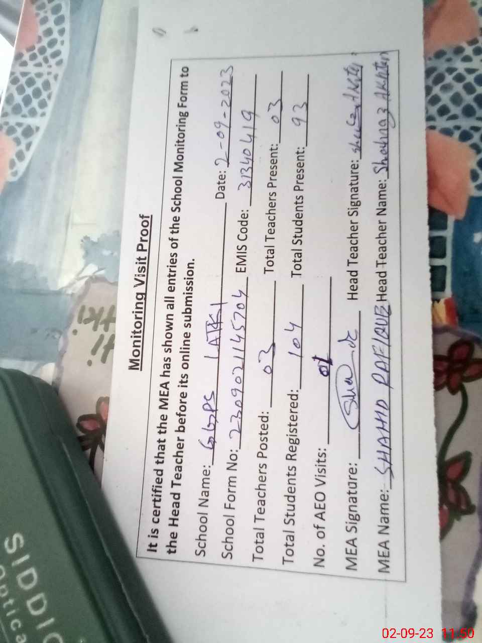 | Attendance Register | Head Teacher | MEA with School | Visit Proof |