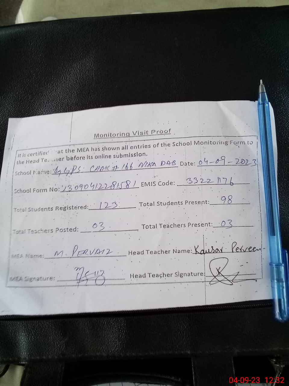 | Attendance Register | Head Teacher | MEA with School | Visit Proof |