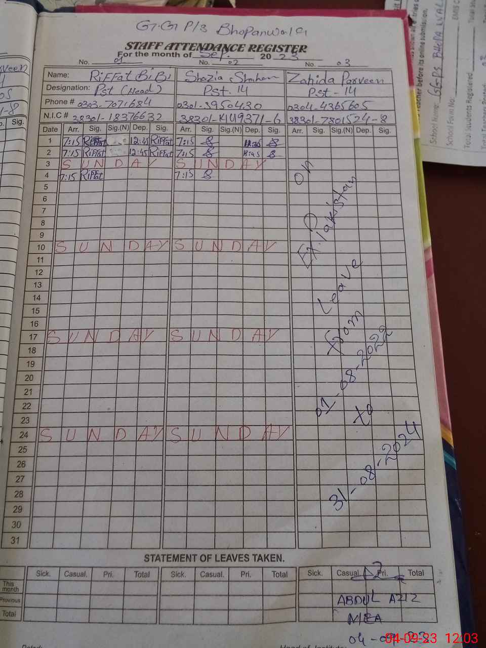 | CNIC | Full Name | Designation | R/C | Absence During Last Calender Month |