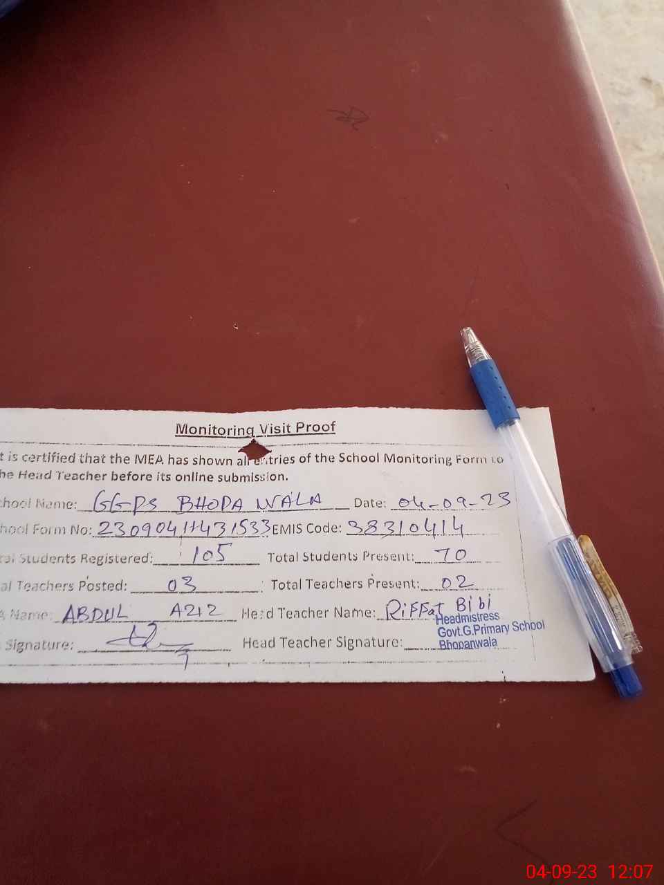 | Attendance Register | Head Teacher | MEA with School | Visit Proof |