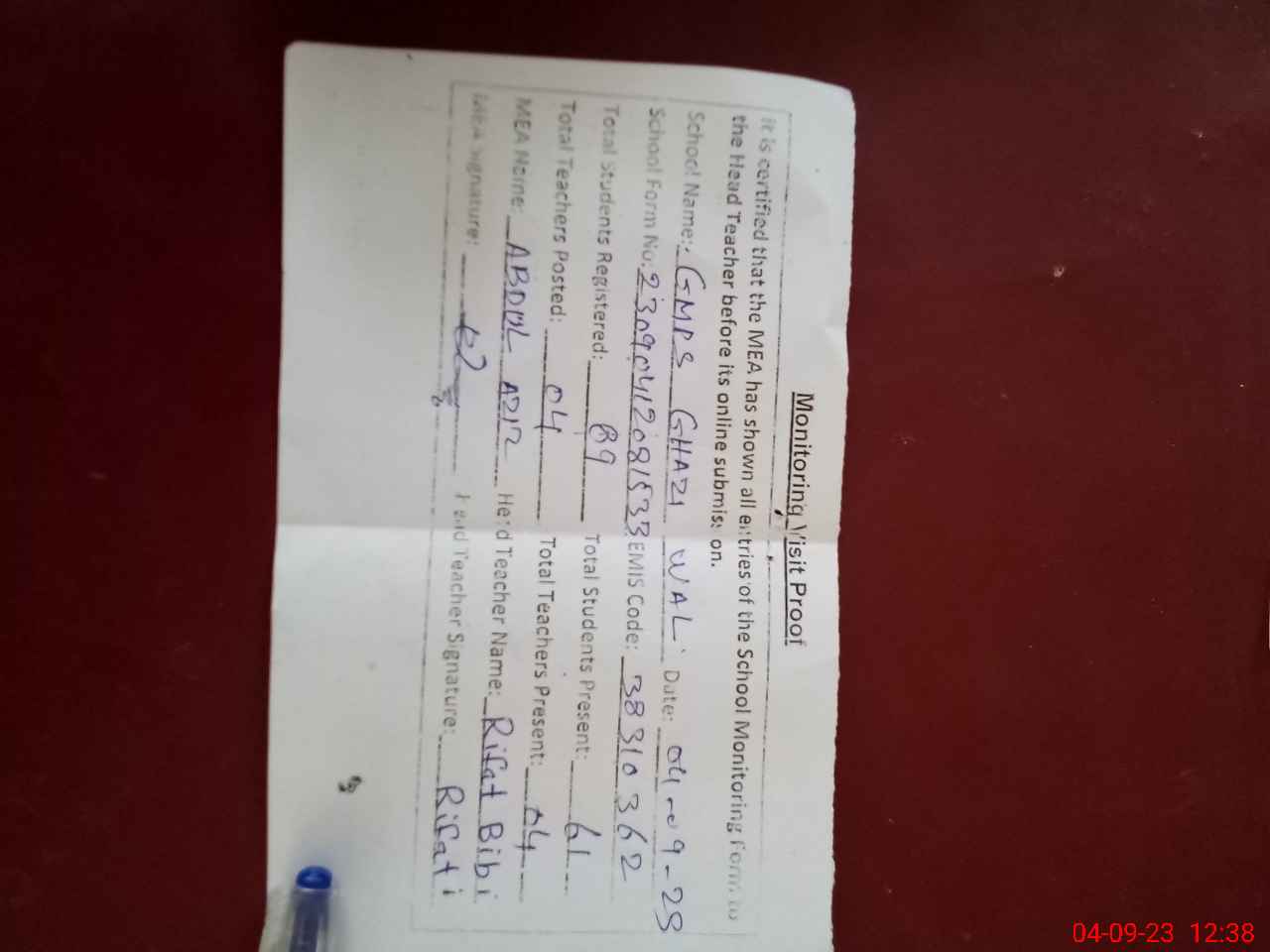 | Attendance Register | Head Teacher | MEA with School | Visit Proof |