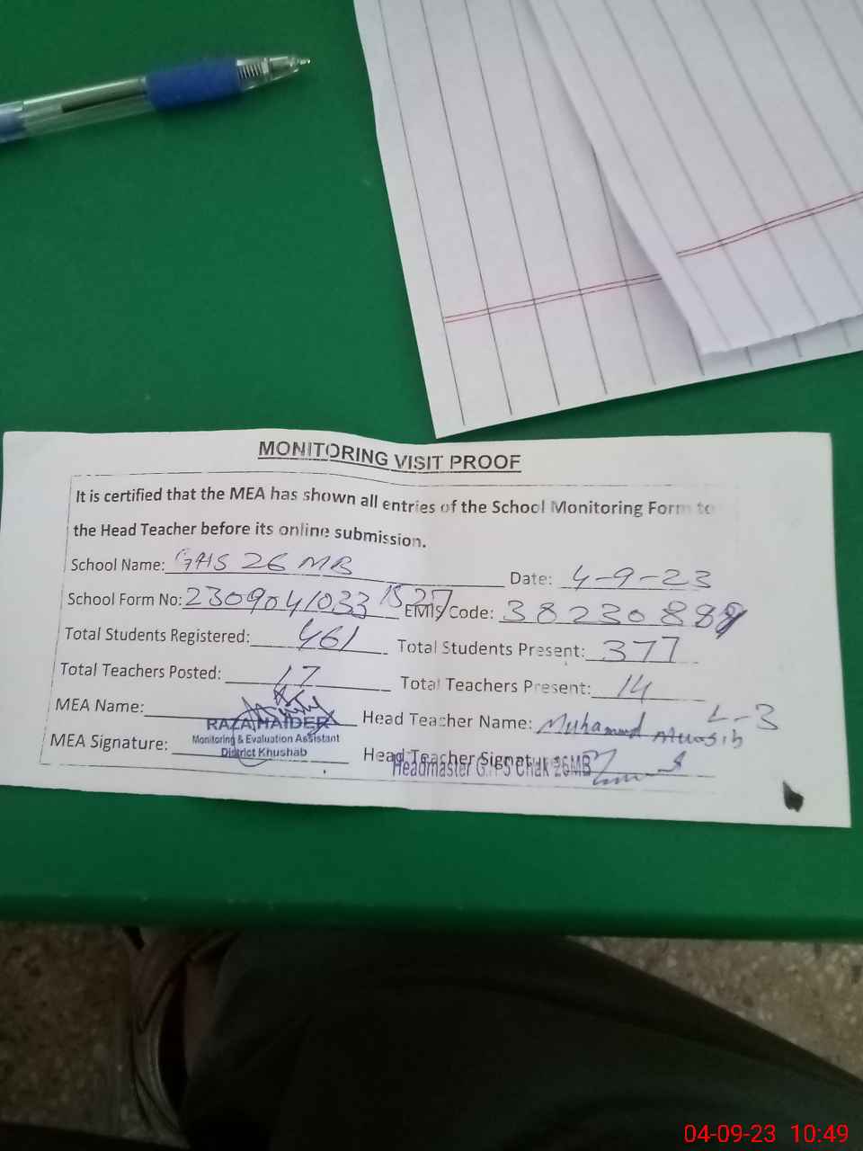 | EMIS Code: 38230889 | Name of School: GHS CHAK NO. 26/MB | |||