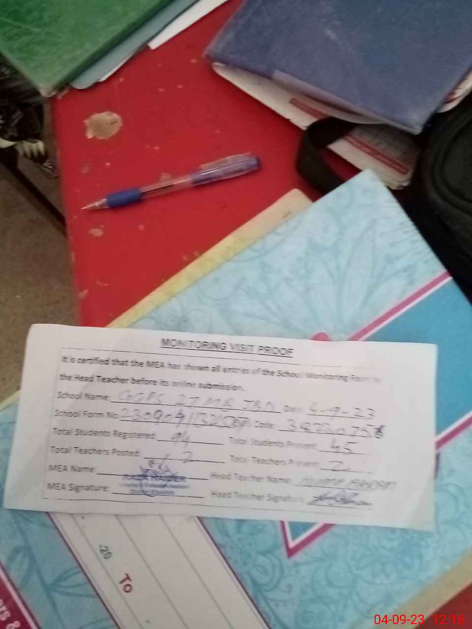 | Attendance Register | Head Teacher | MEA with School | Visit Proof |