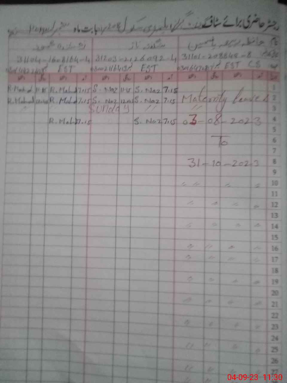 | Leave | Duty | Absent | Maternity | Medical | Ex- Pak |