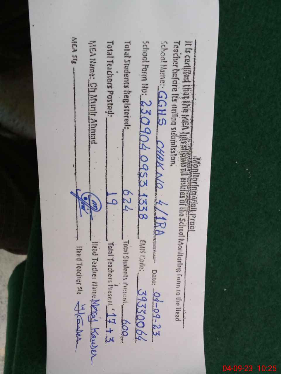 | Certified that this School was Inspected by the Undersigned MEA/DMO Today and the Information Stated Above is as Per Record. | |||||