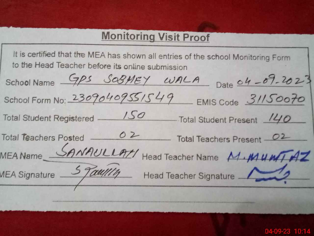 | Attendance Register | Head Teacher | MEA with School | Visit Proof |