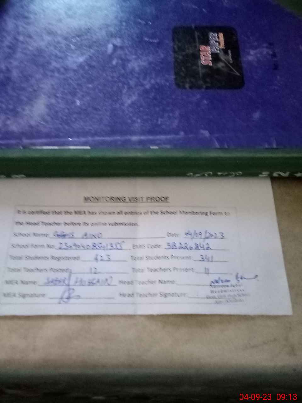 | Attendance Register | Head Teacher | MEA with School | Visit Proof |