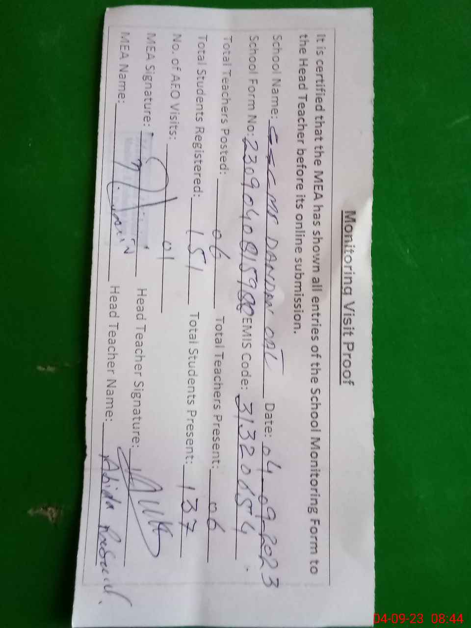 | Attendance Register | Head Teacher | MEA with School | Visit Proof |