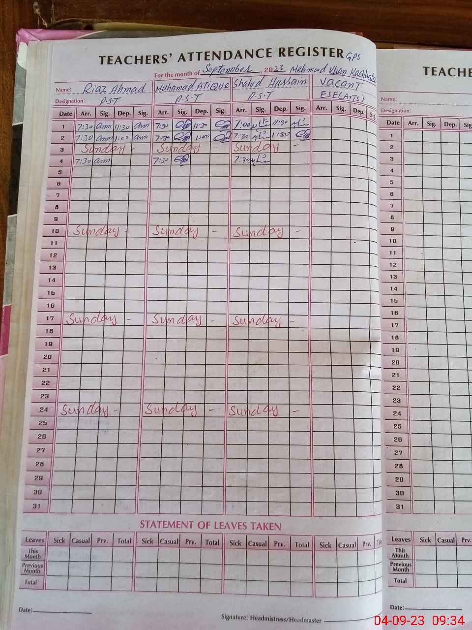 | Attendance Register | Head Teacher | MEA with School | Visit Proof |