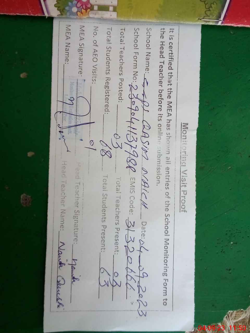 | Attendance Register | Head Teacher | MEA with School | Visit Proof |