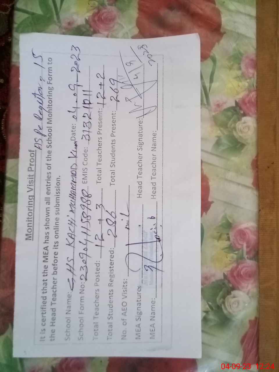 | Attendance Register | Head Teacher | MEA with School | Visit Proof |