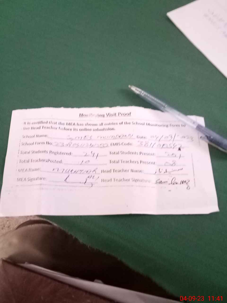 | Attendance Register | Head Teacher | MEA with School | Visit Proof |