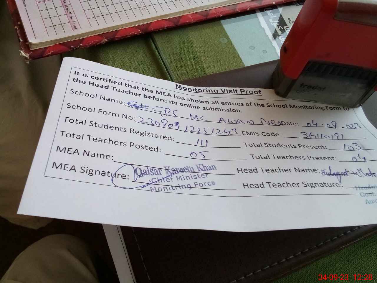 | EMIS Code: 36110191 | Name of School: GPS MC AWAN PURA | |||