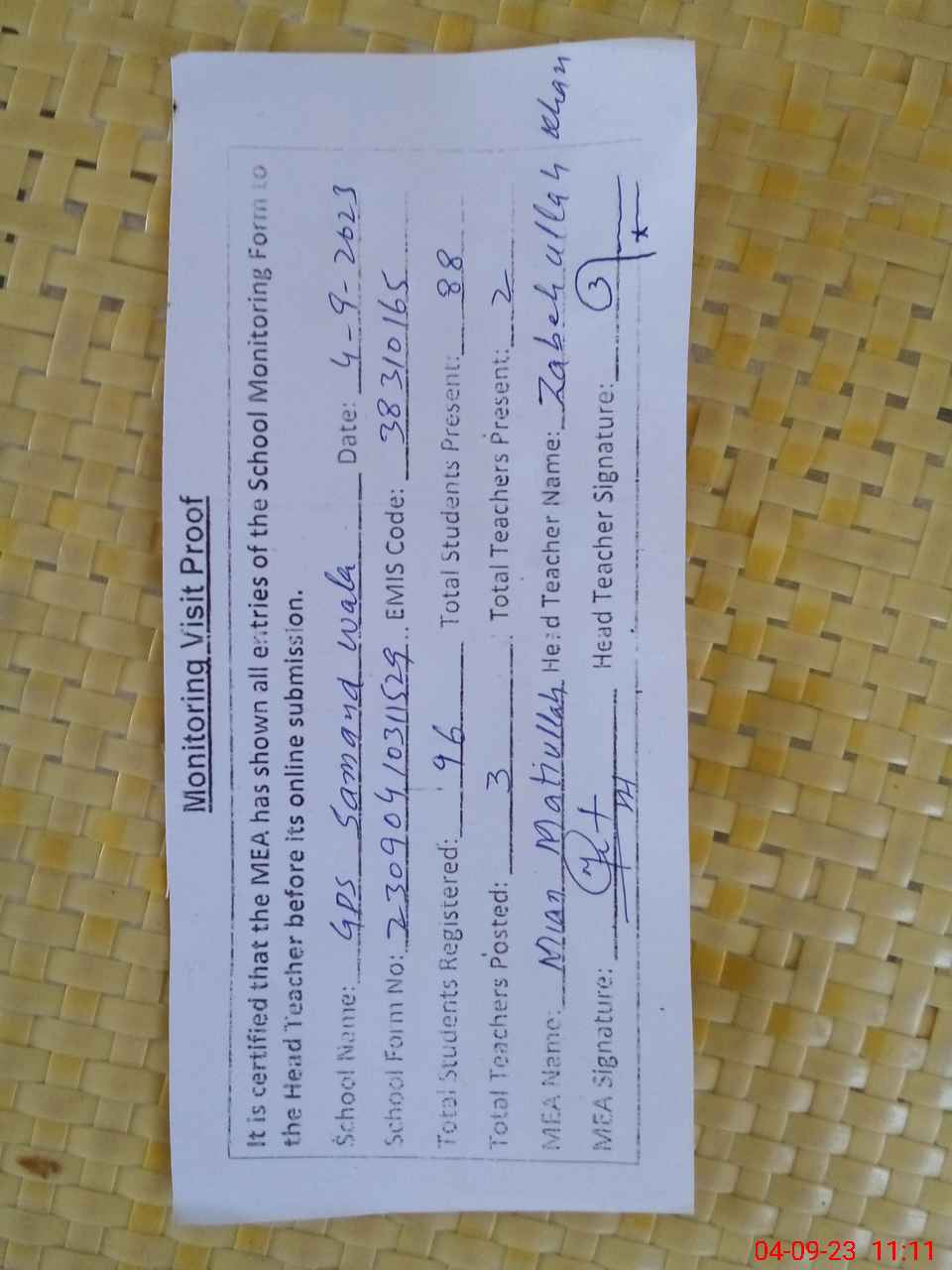 | Attendance Register | Head Teacher | MEA with School | Visit Proof |