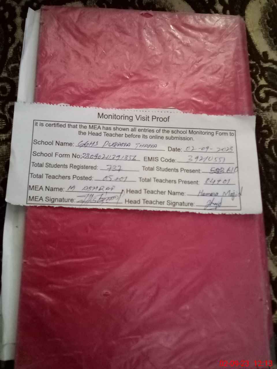 | Attendance Register | Head Teacher | MEA with School | Visit Proof |