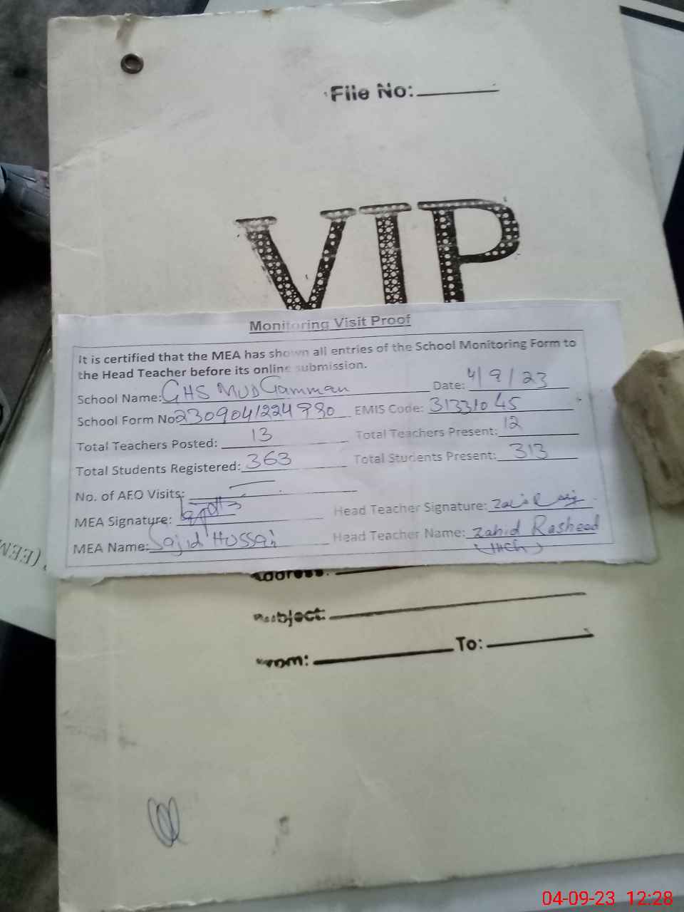 | Attendance Register | Head Teacher | MEA with School | Visit Proof |