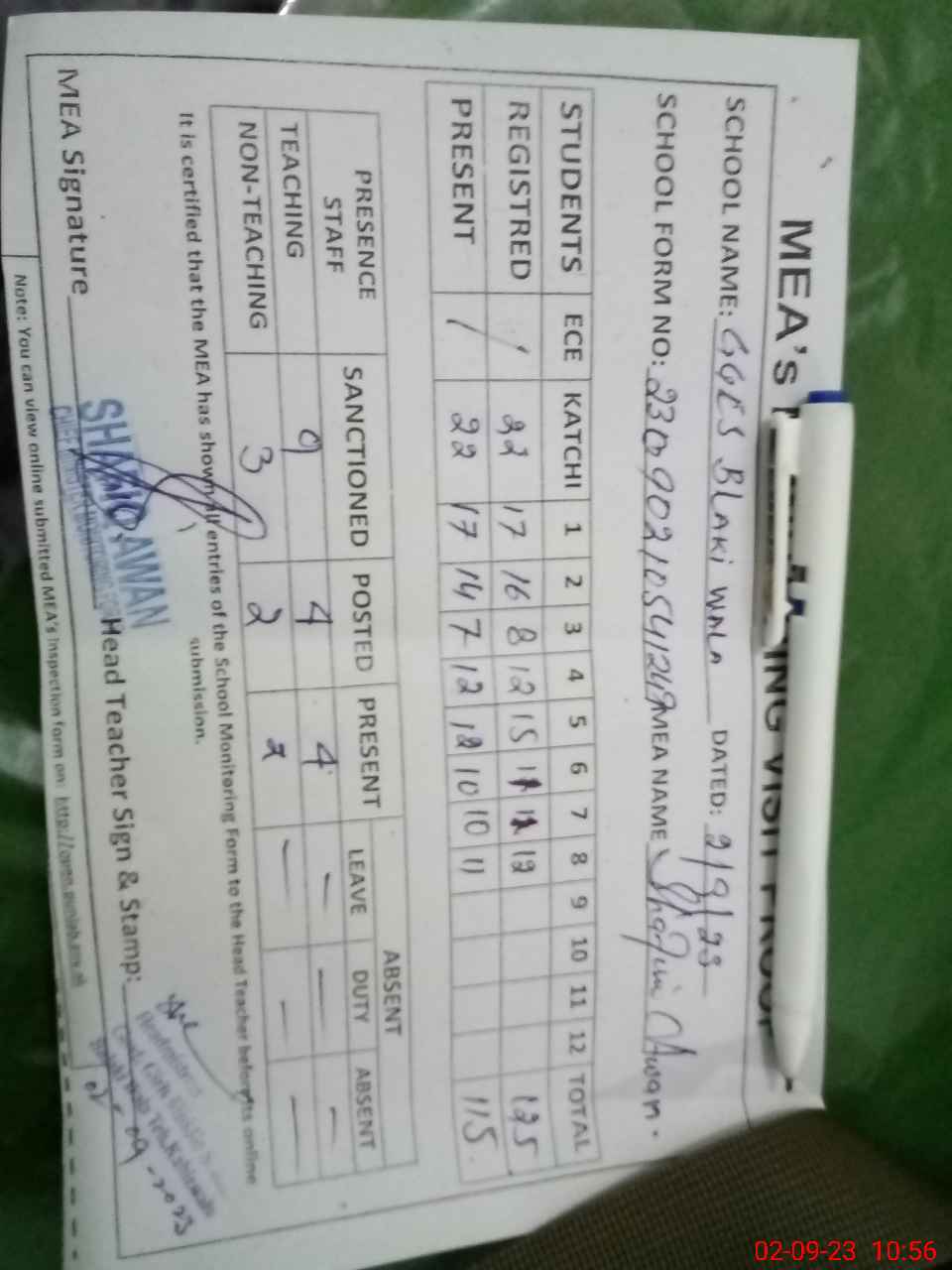 | Attendance Register | Head Teacher | MEA with School | Visit Proof |
