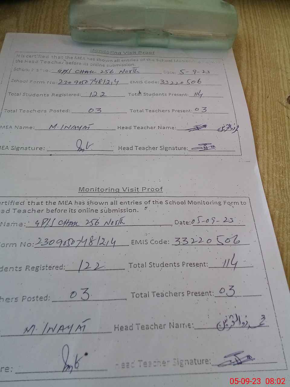 | Attendance Register | Head Teacher | MEA with School | Visit Proof |