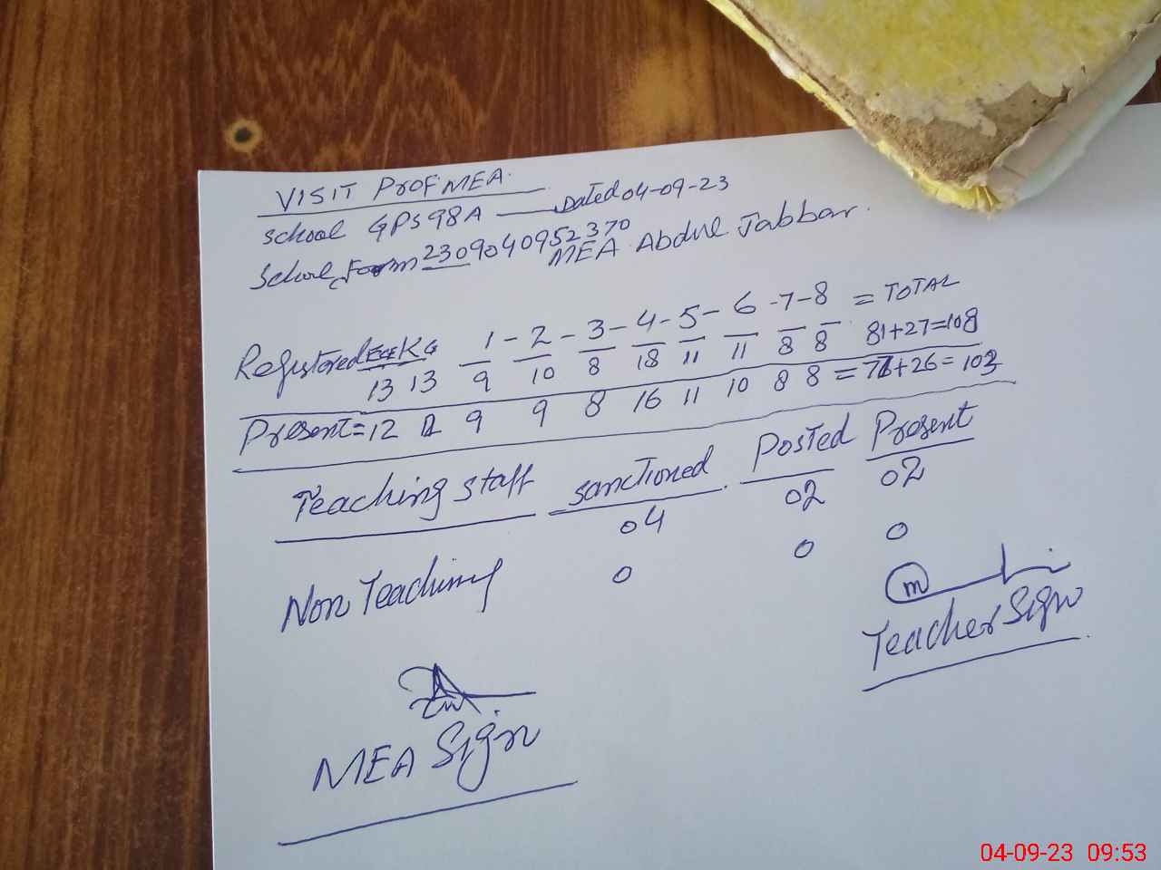 | Attendance Register | Head Teacher | MEA with School | Visit Proof |
