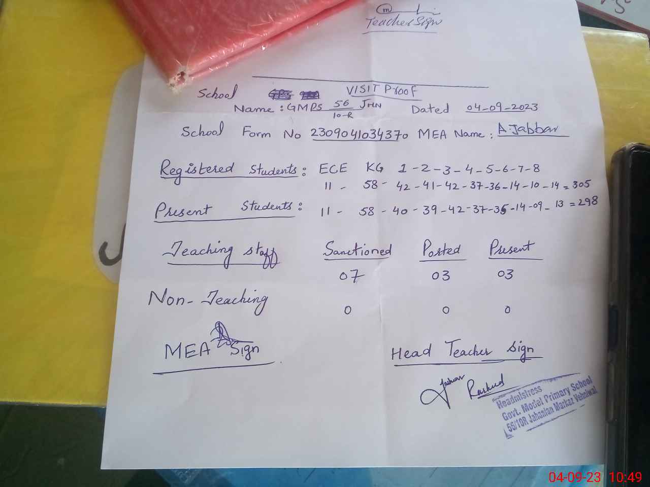 | Attendance Register | Head Teacher | MEA with School | Visit Proof |