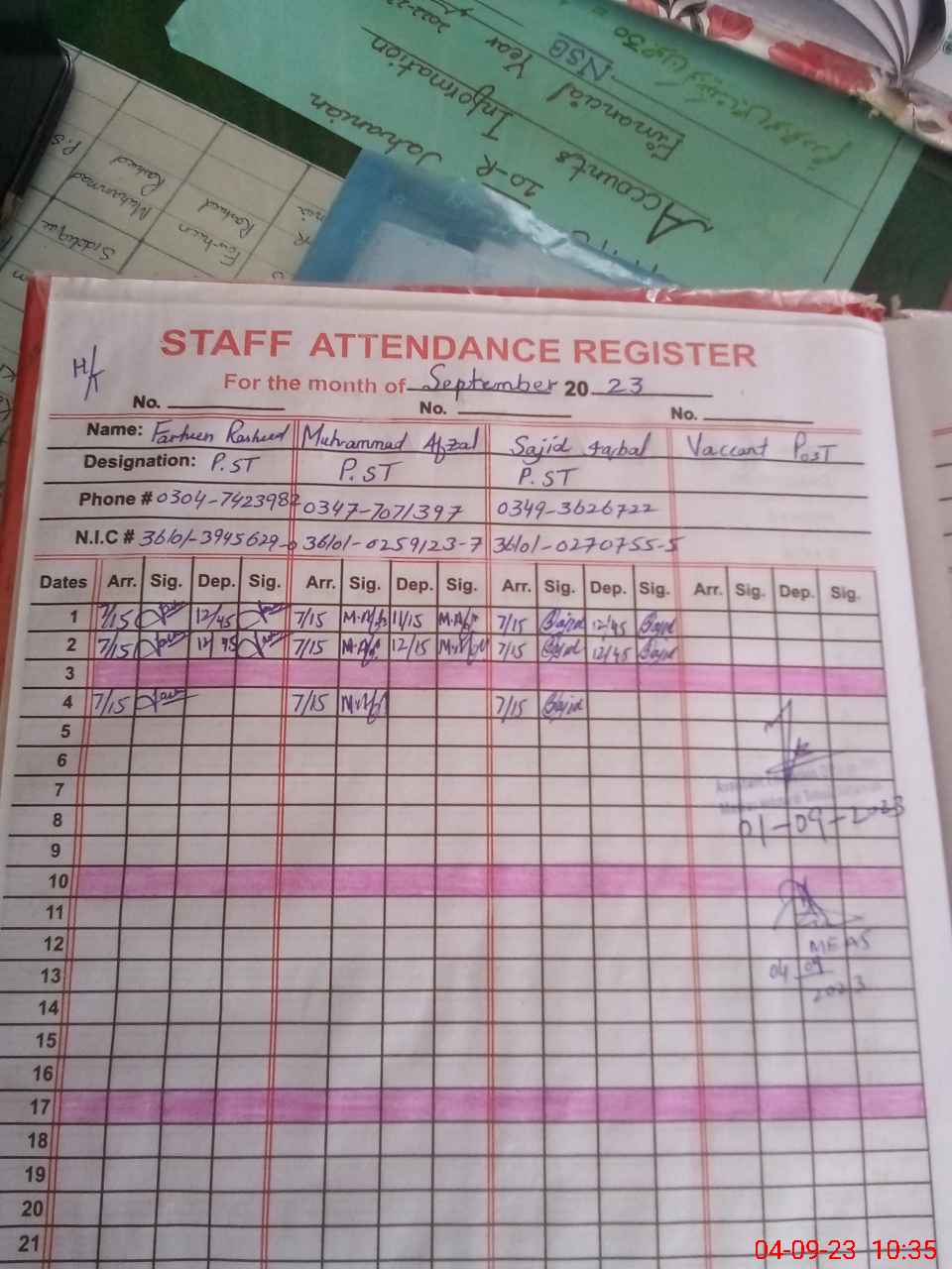 | CNIC | Full Name | Designation | R/C | Absence During Last Calender Month |