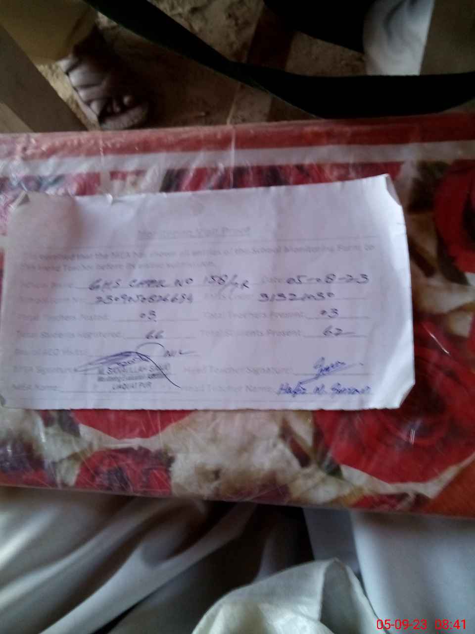 | Monitoring Date: 05-09-2023 | Start Time: 05-09-2023 08:13 AM | End Time: 05-09-2023 08:42 AM | Name of MEA: Mu**** Sa**** Ul**** Sa**** | |