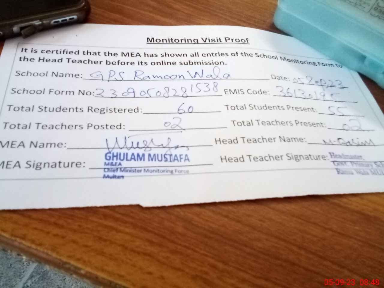 | Monitoring Date: 05-09-2023 | Start Time: 05-09-2023 08:02 AM | End Time: 05-09-2023 08:59 AM | Name of MEA: Gh**** Mu**** | |