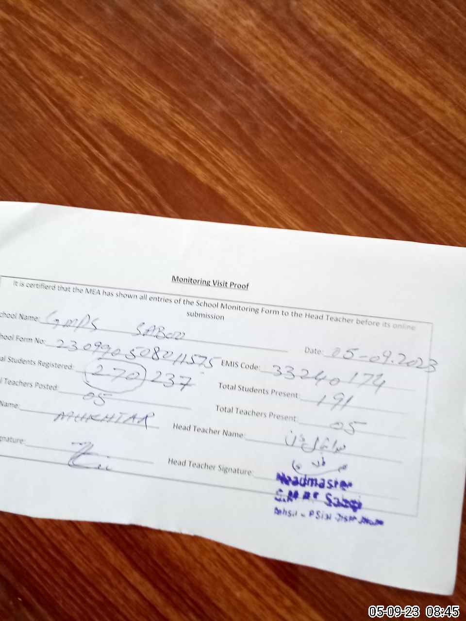 | Attendance Register | Head Teacher | MEA with School | Visit Proof |