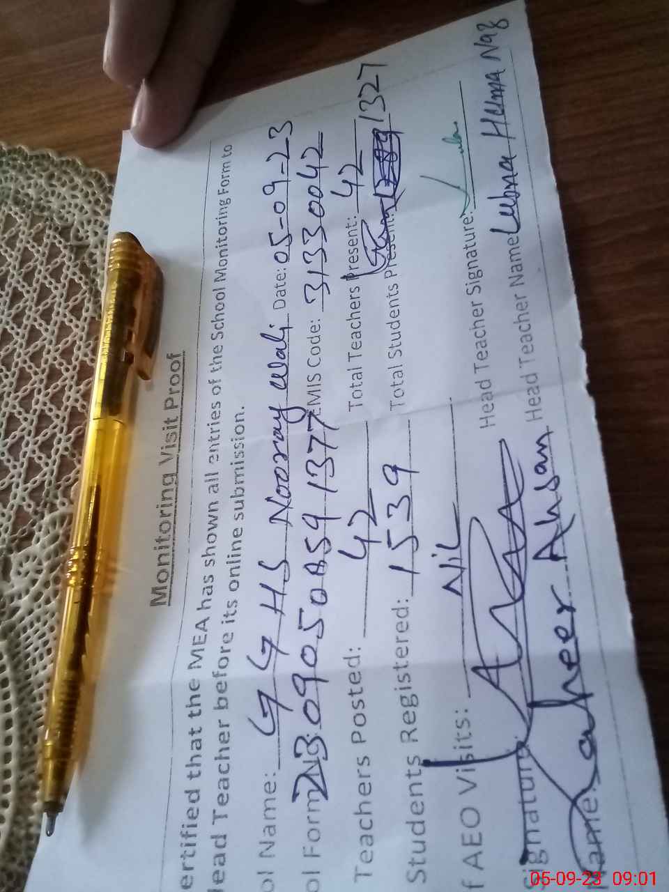 | Attendance Register | Head Teacher | MEA with School | Visit Proof |