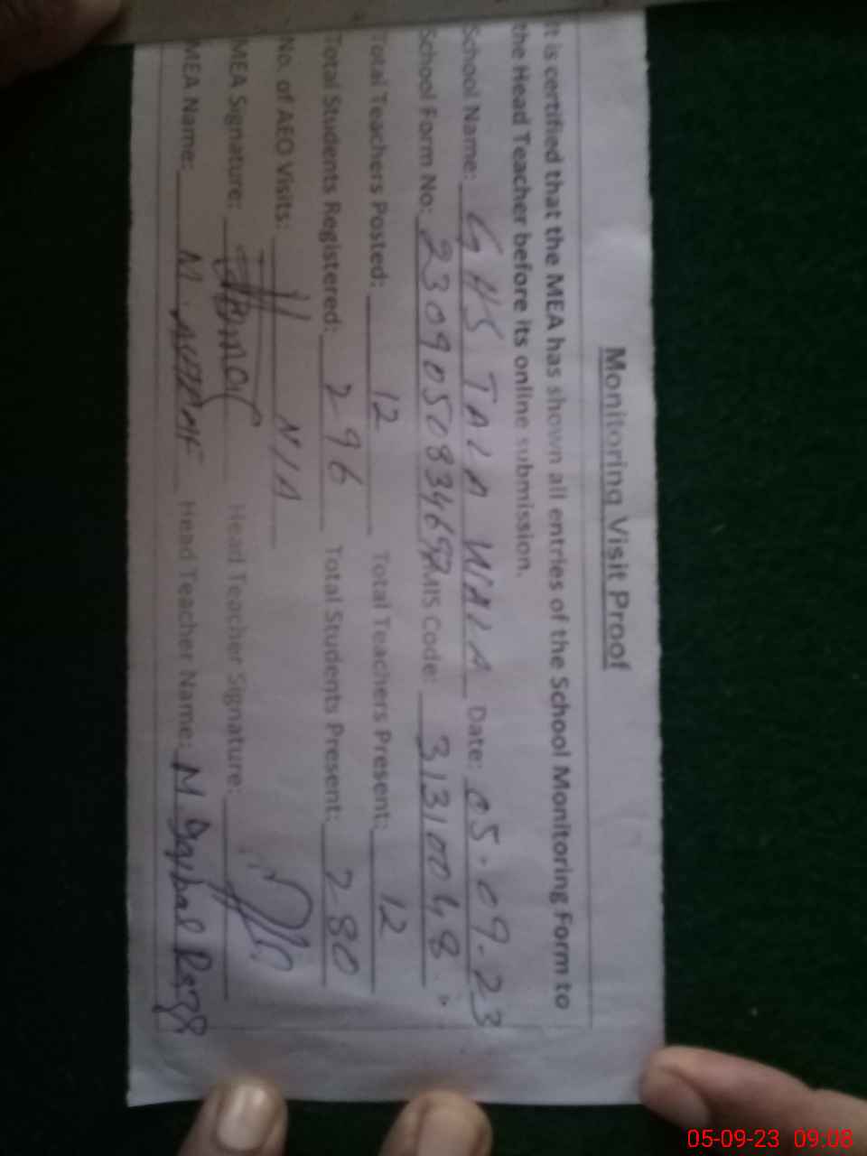 | Attendance Register | Head Teacher | MEA with School | Visit Proof |