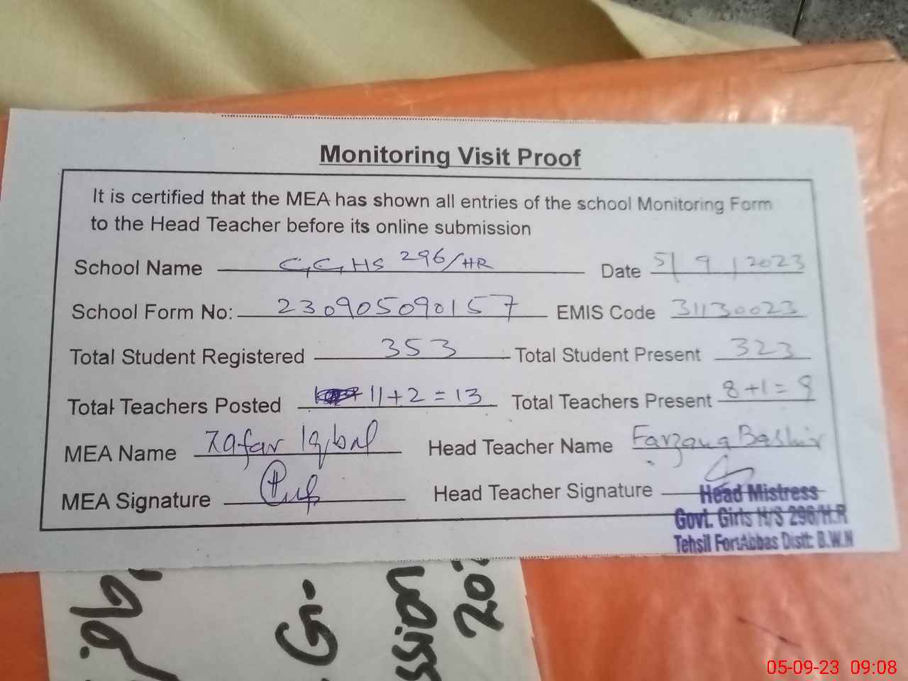 | Attendance Register | Head Teacher | MEA with School | Visit Proof |