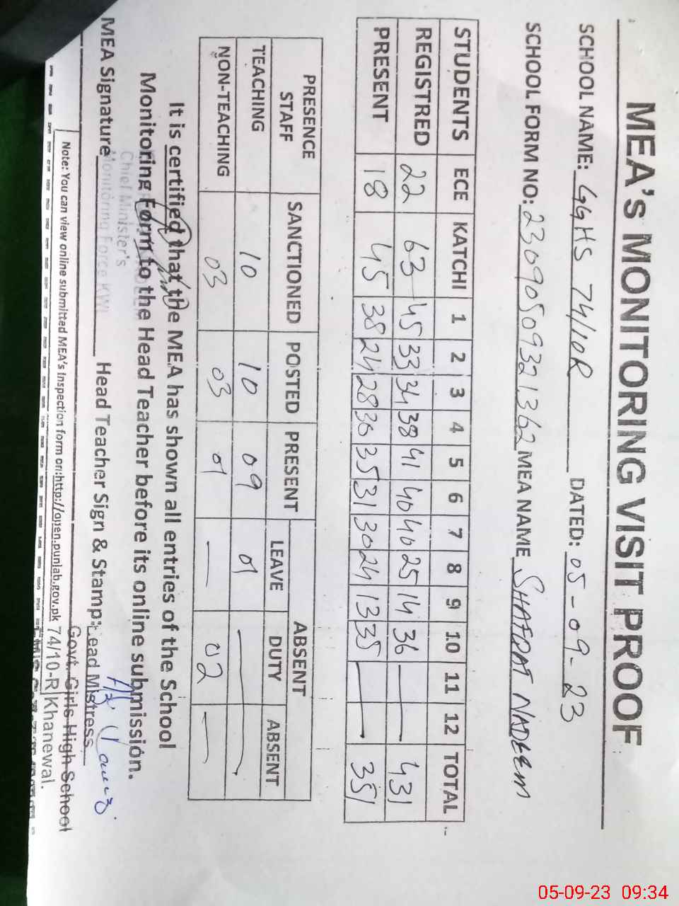 | EMIS Code: 36420383 | Name of School: GGHS 74/10-R, KHANEWAL | |||