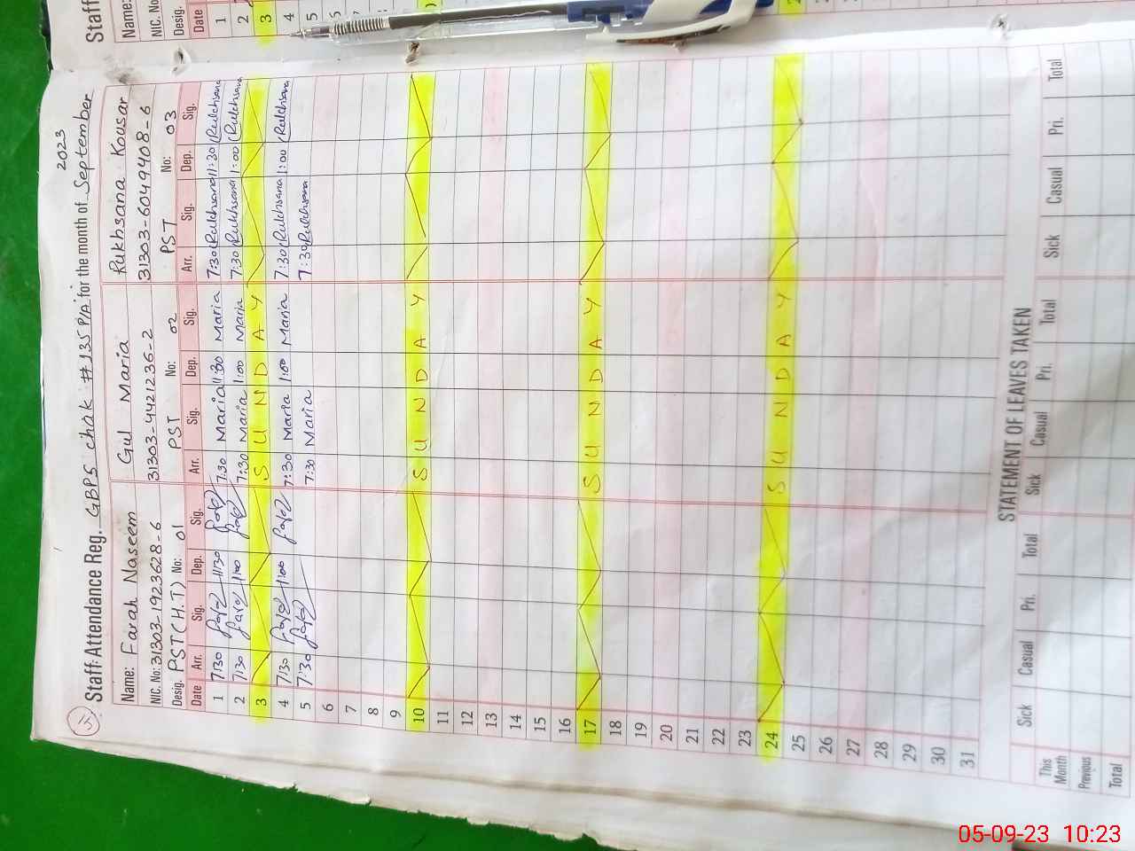 | CNIC | Full Name | Designation | R/C | Absence During Last Calender Month |