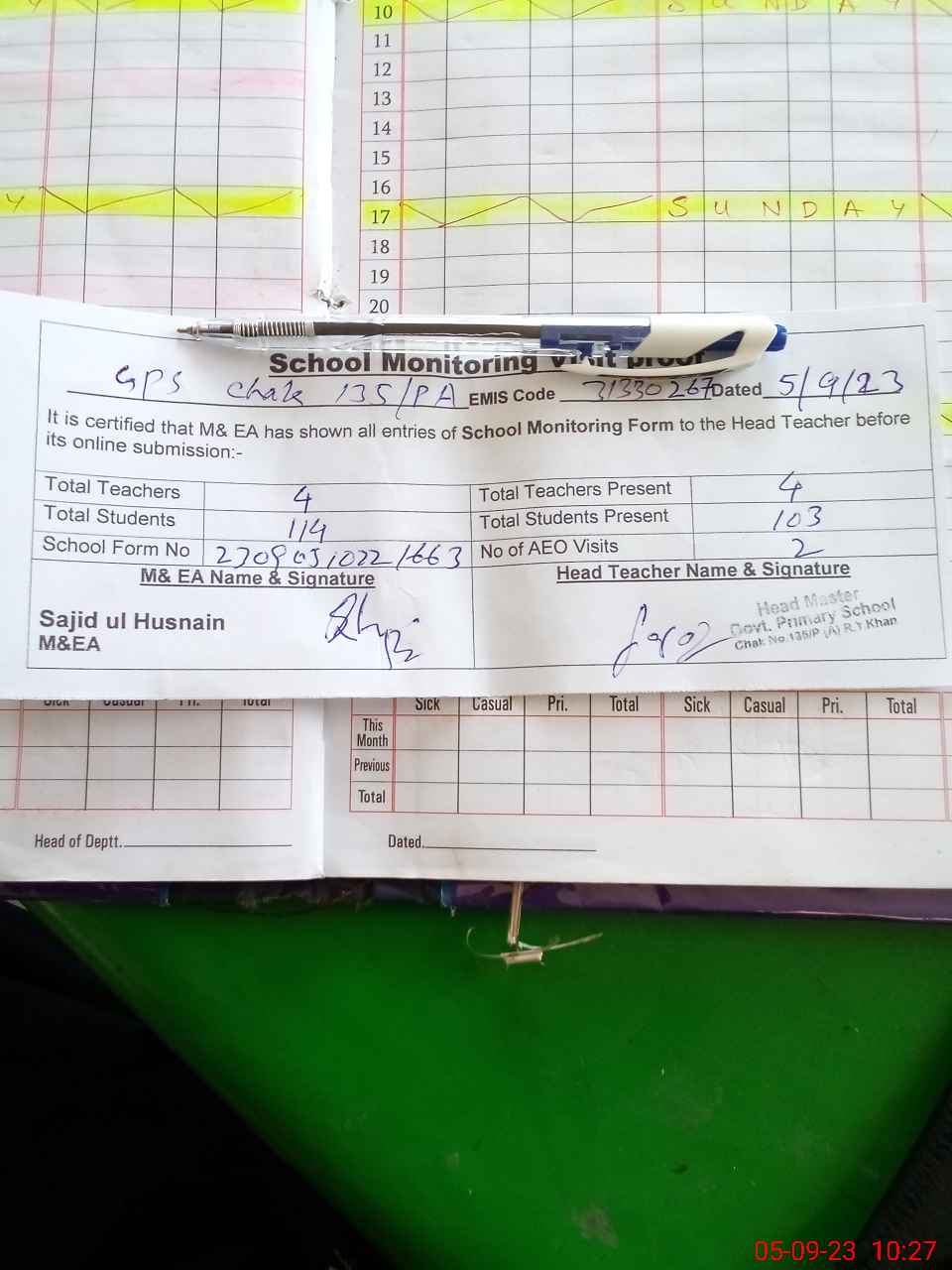 | Attendance Register | Head Teacher | MEA with School | Visit Proof |