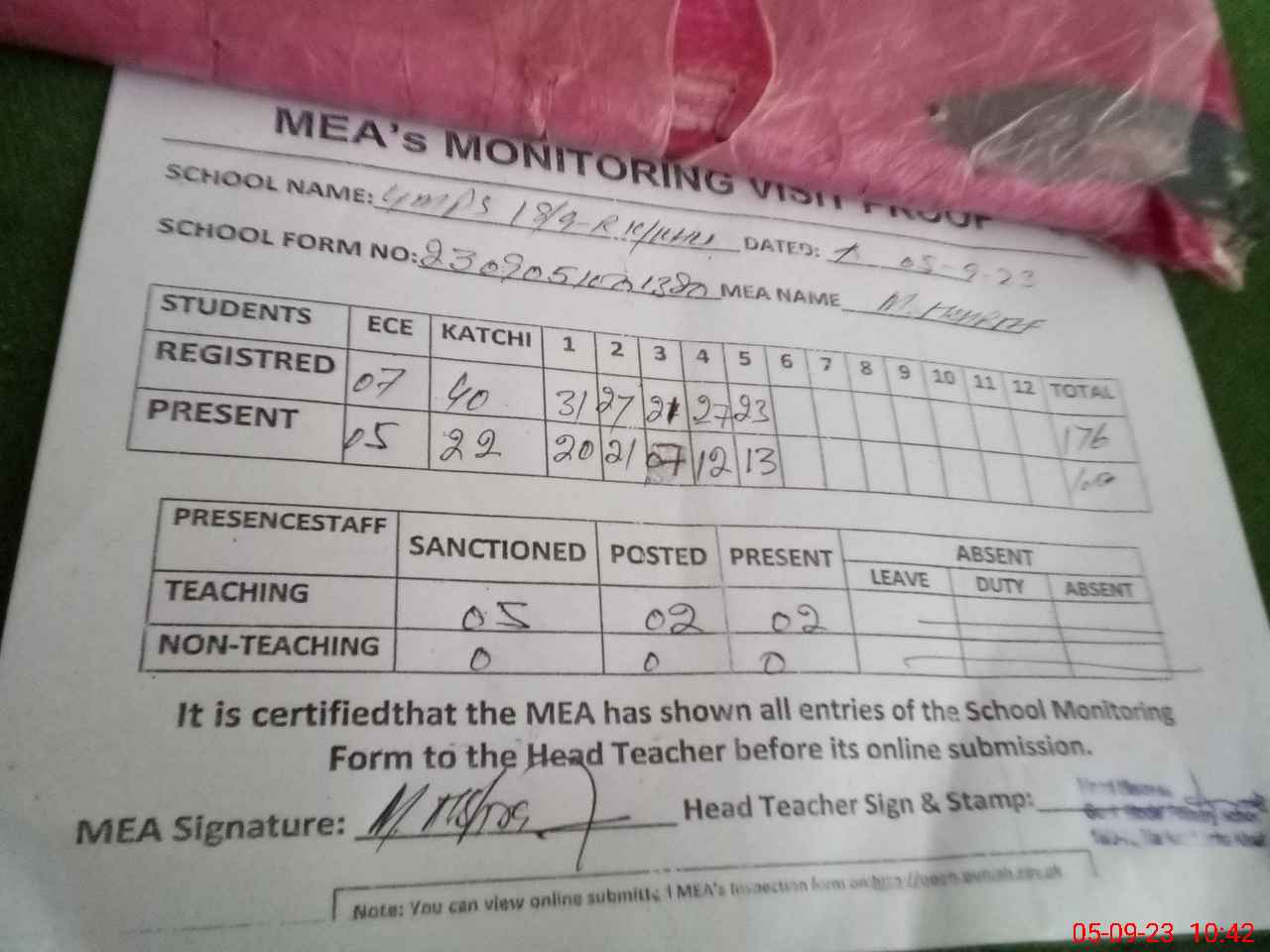 | Attendance Register | Head Teacher | MEA with School | Visit Proof |