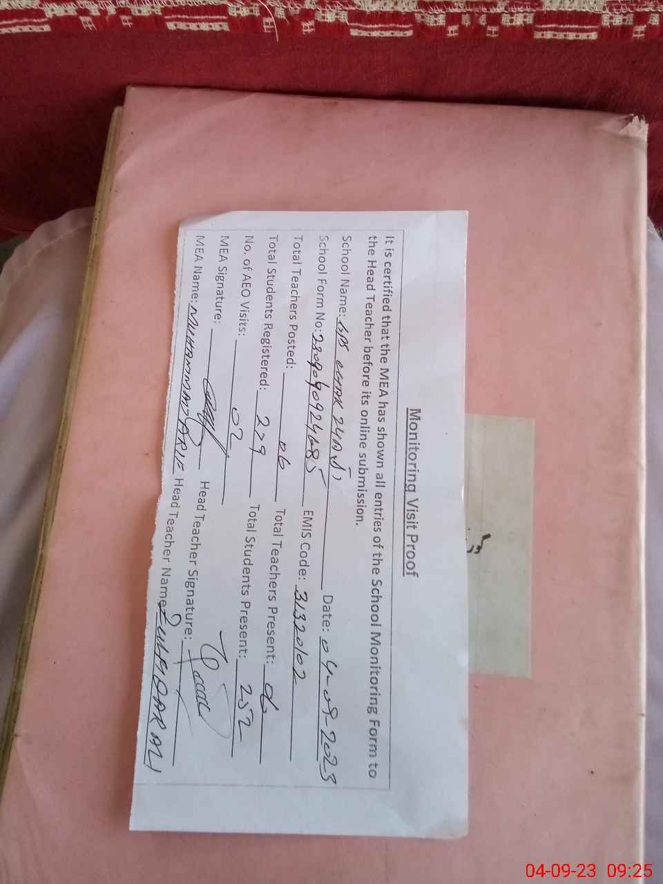 | Attendance Register | Head Teacher | MEA with School | Visit Proof |