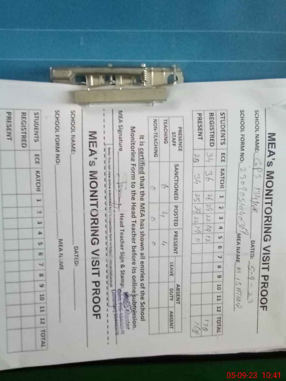 | Attendance Register | Head Teacher | MEA with School | Visit Proof |