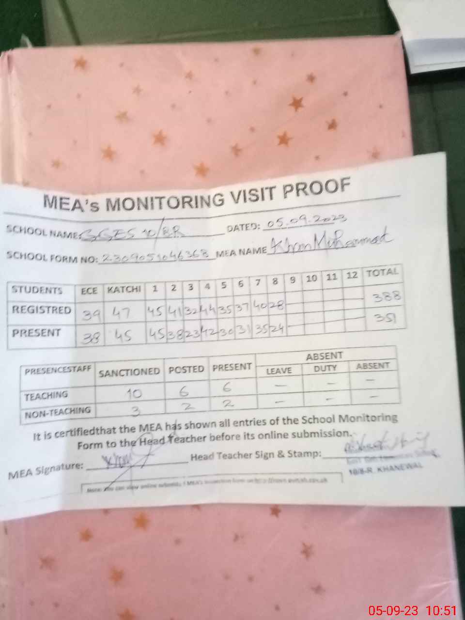 | Attendance Register | Head Teacher | MEA with School | Visit Proof |