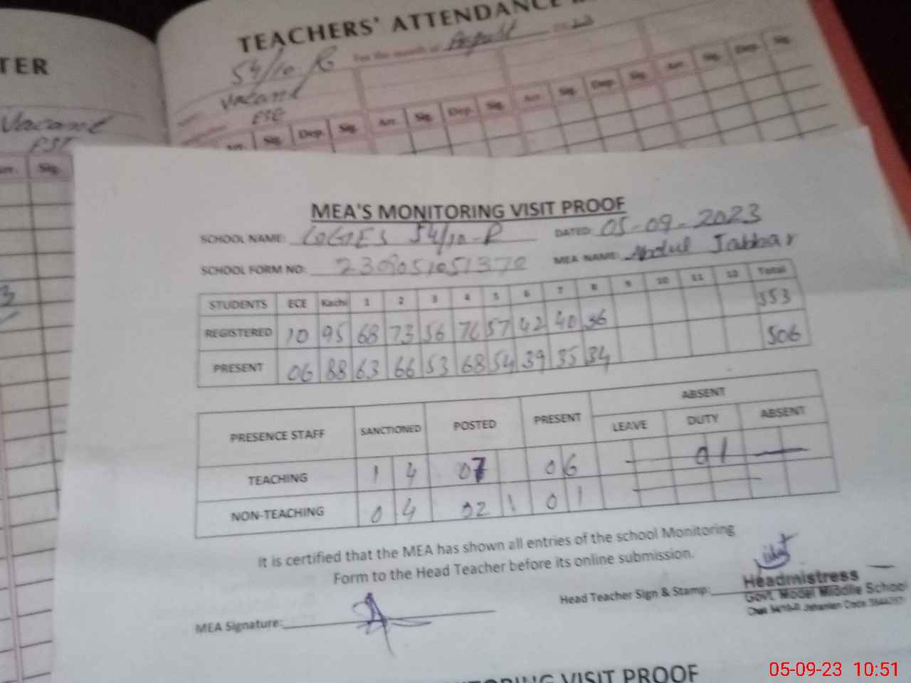 | Attendance Register | Head Teacher | MEA with School | Visit Proof |
