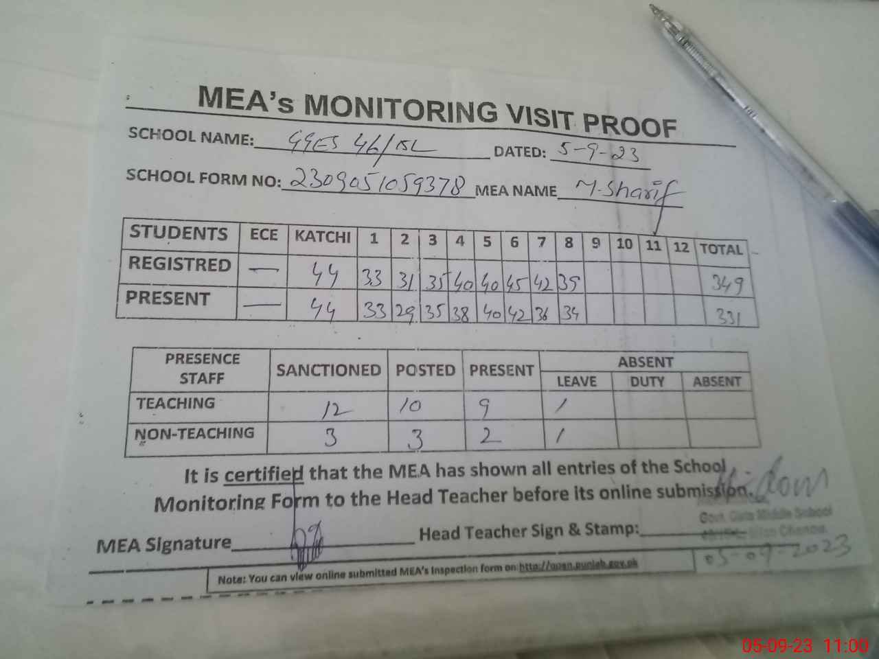 | Attendance Register | Head Teacher | MEA with School | Visit Proof |