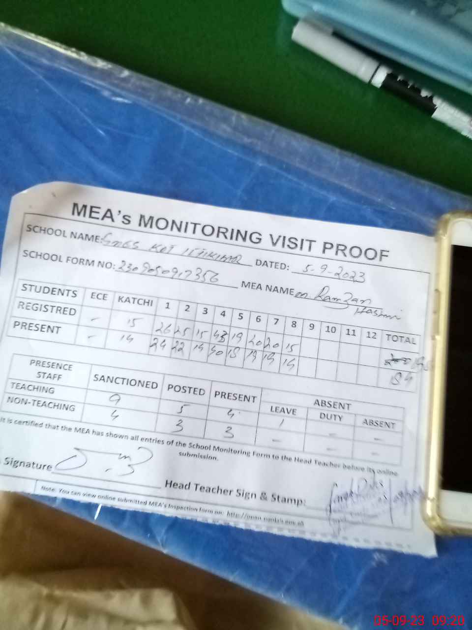 | Attendance Register | Head Teacher | MEA with School | Visit Proof |