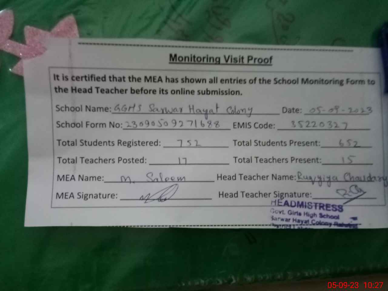 | EMIS Code: 35220327 | Name of School: GGHS SARWAR HAYAT COLONY (Newly upgraded) | |||