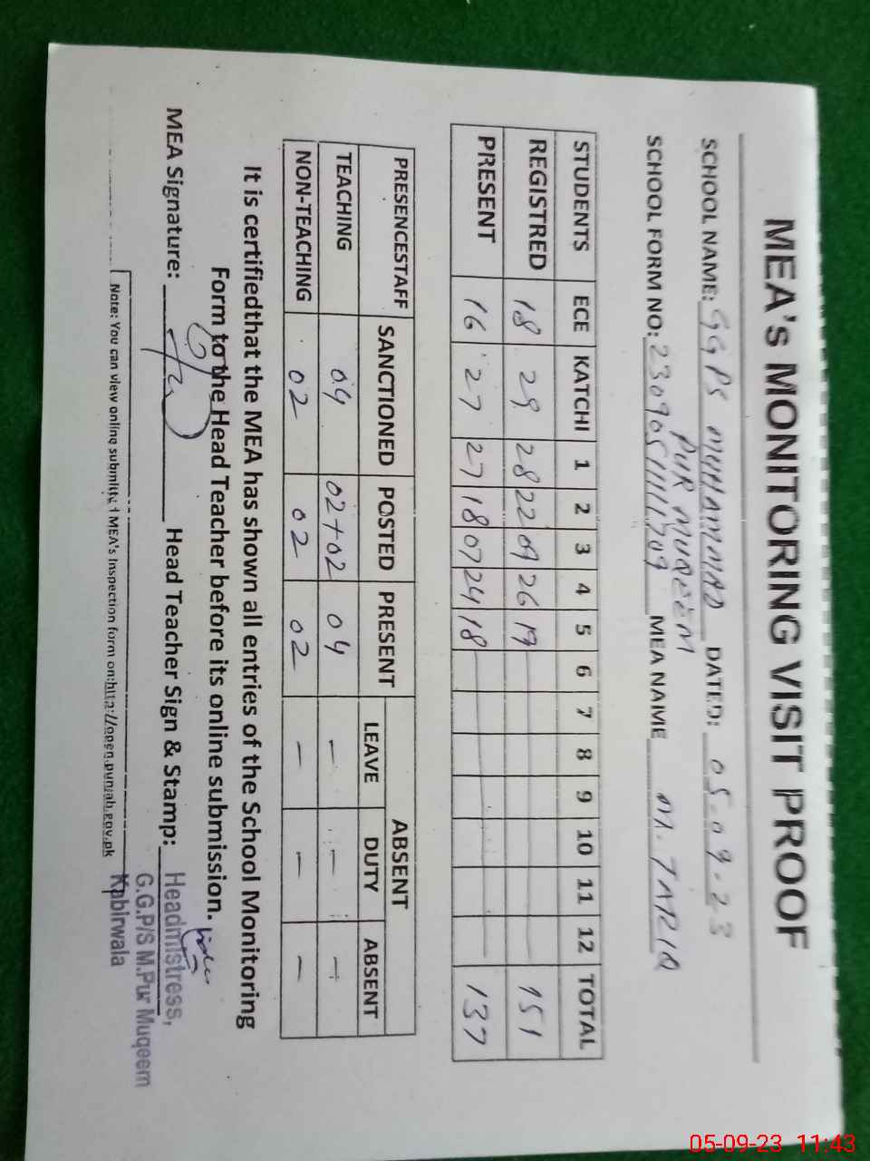 | Attendance Register | Head Teacher | MEA with School | Visit Proof |