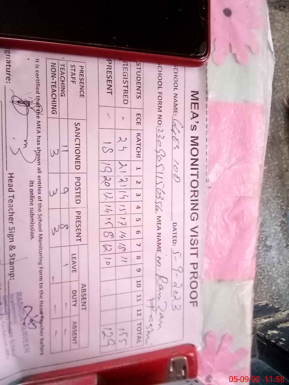 | Attendance Register | Head Teacher | MEA with School | Visit Proof |